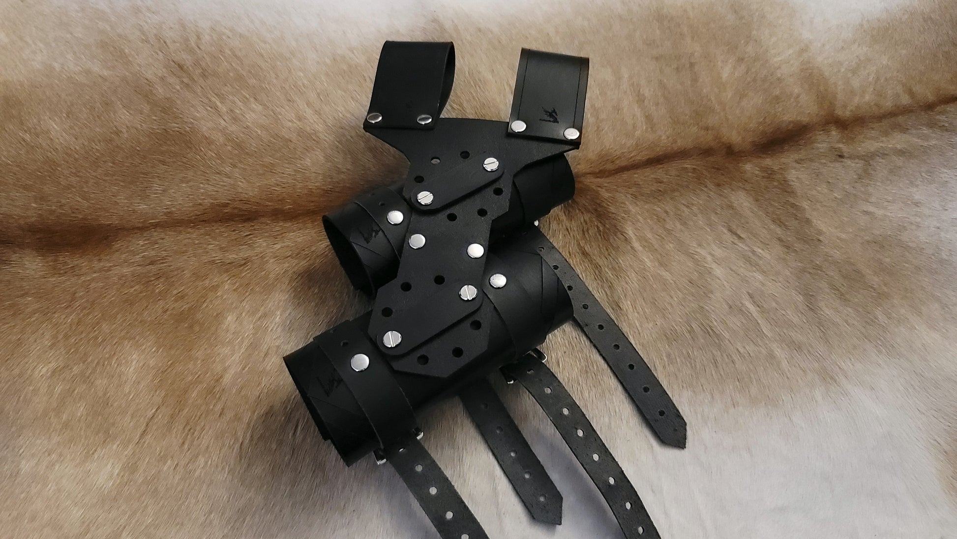 This is an adjustable Rotating Double Sword Frog used to carry foam and latex props. It slides onto a belt and it is designed at an angle for quick draw and for carrying ease.