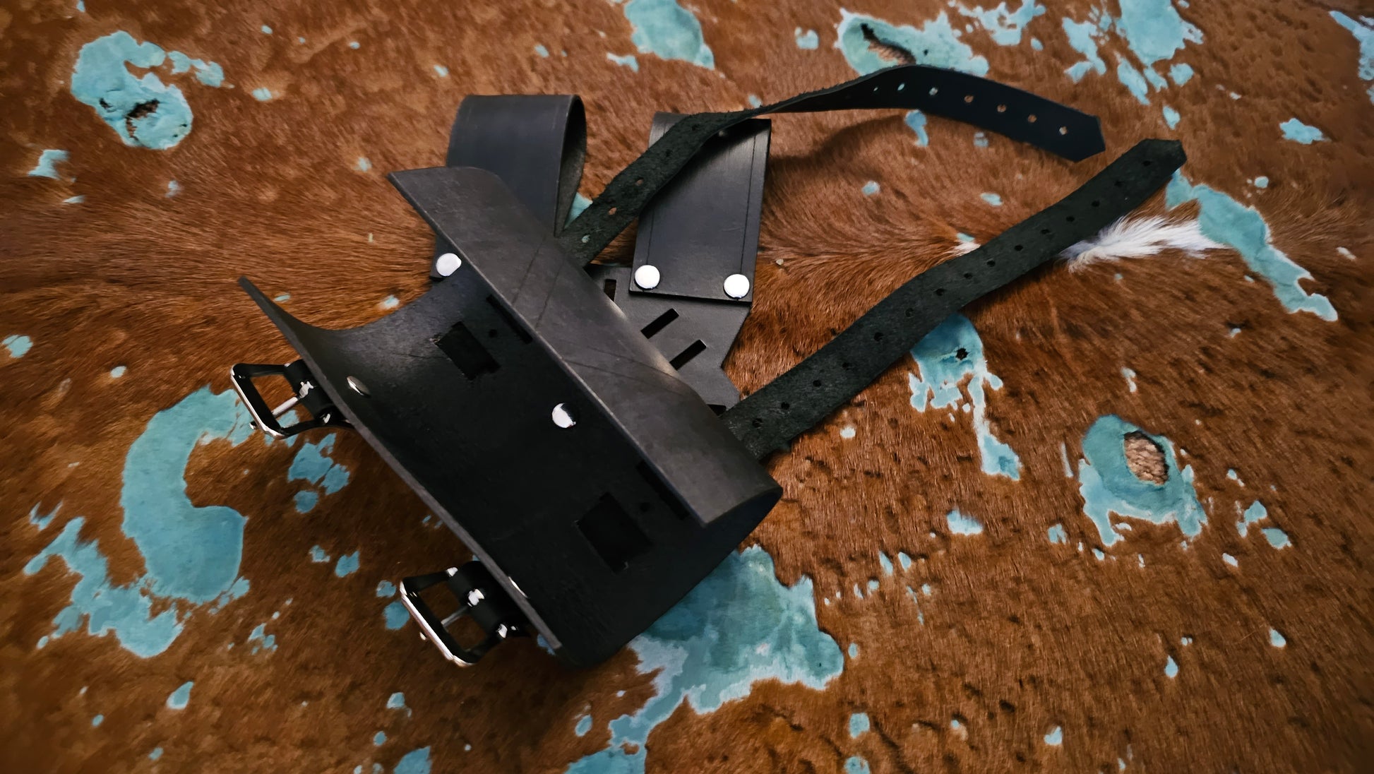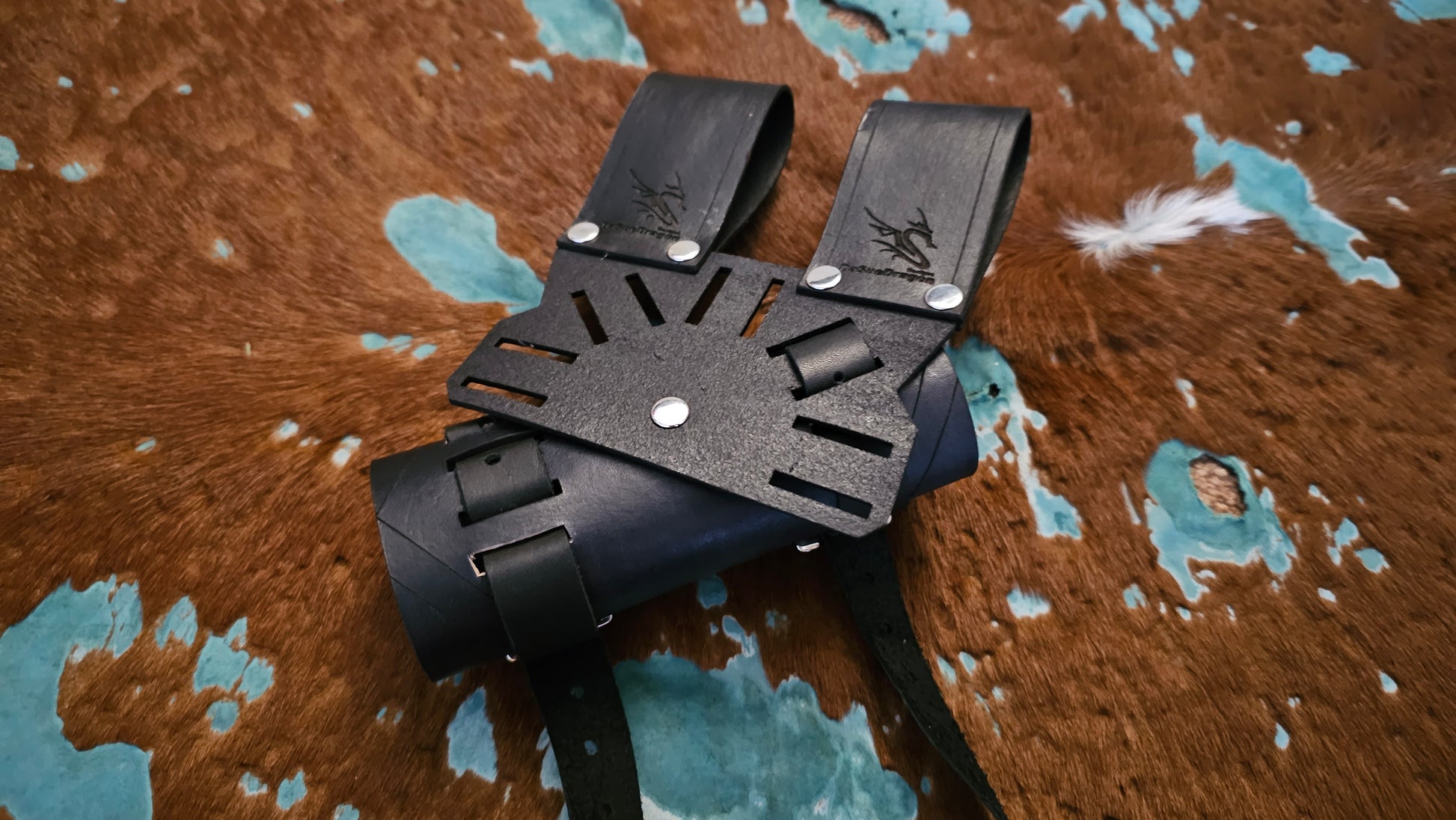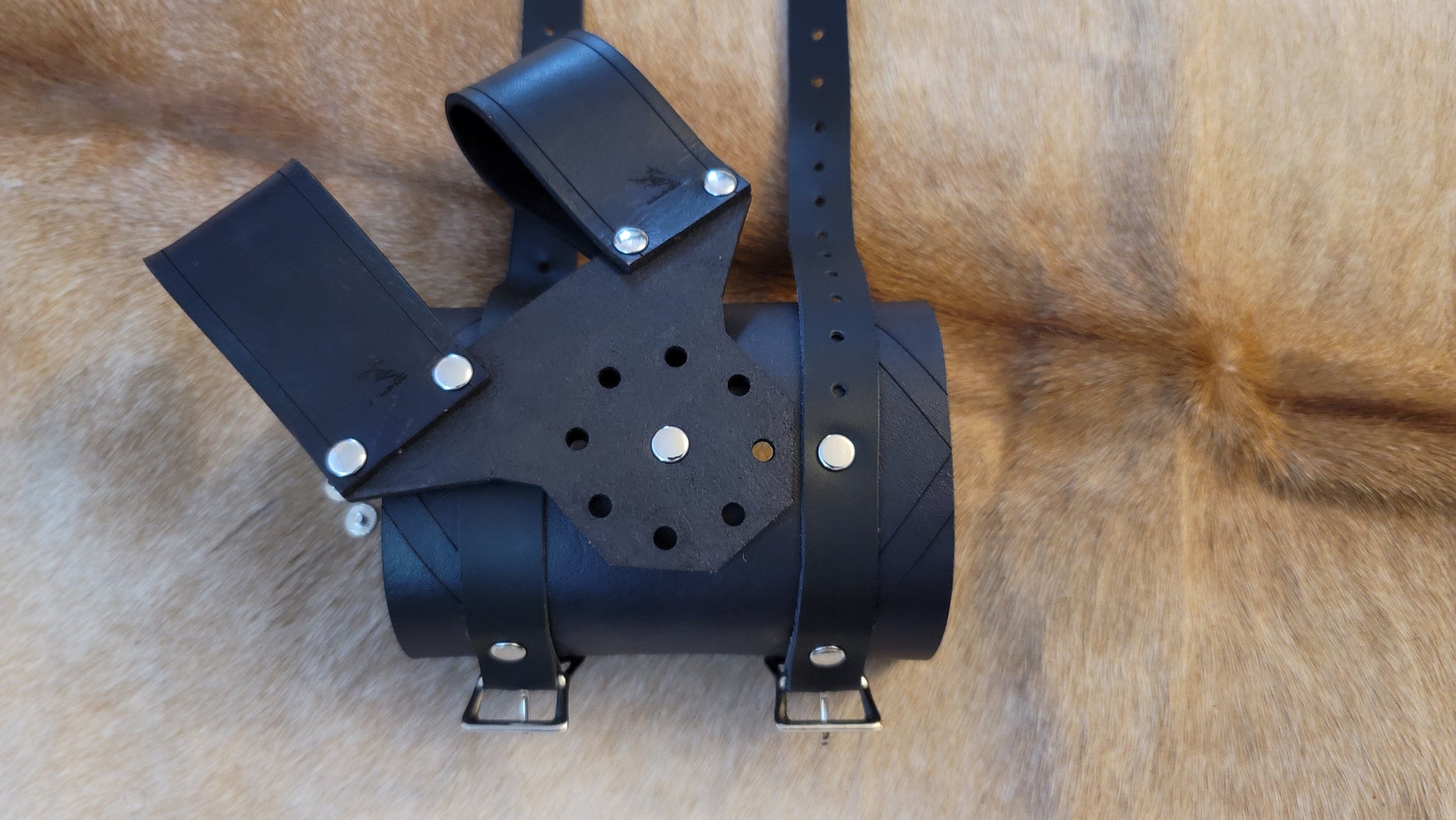 This is an adjustable rotating sword frog used to carry foam and latex weapons. It slides onto a belt and it is designed to be rotated in 45 degree increments for optimal positioning and for carrying ease. Because of this, it is ambidextrous!