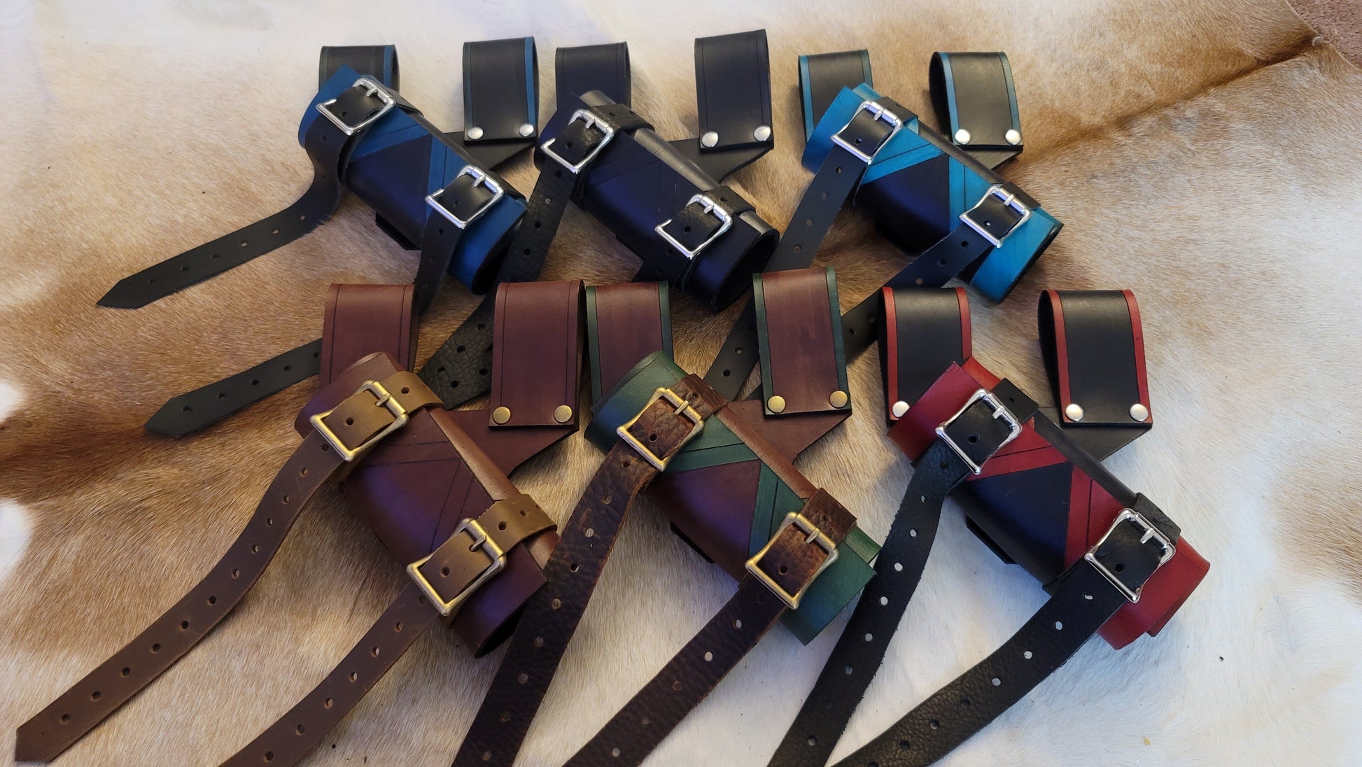 The belts will ALWAYS be the same as the primary color of the sheath.