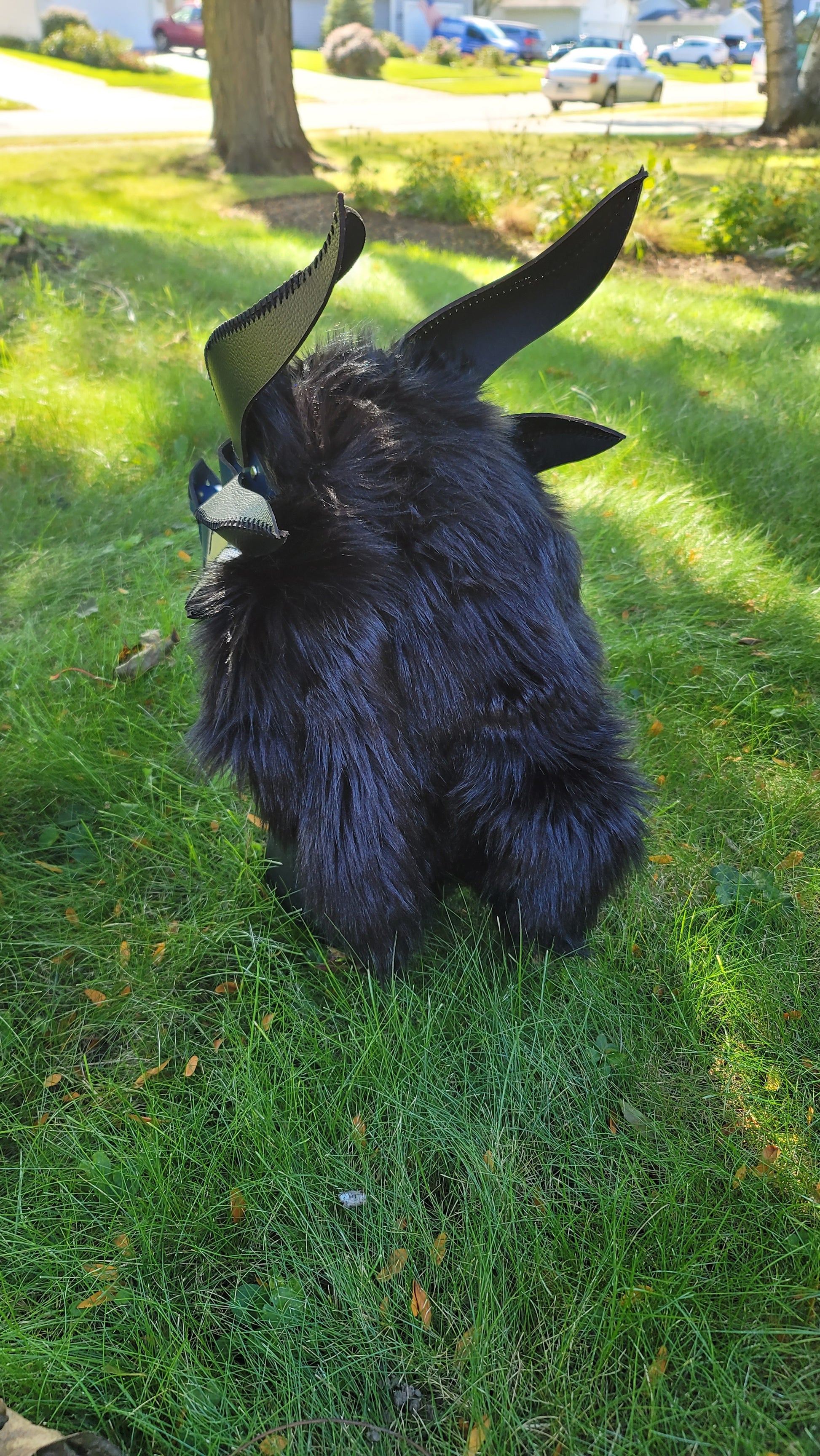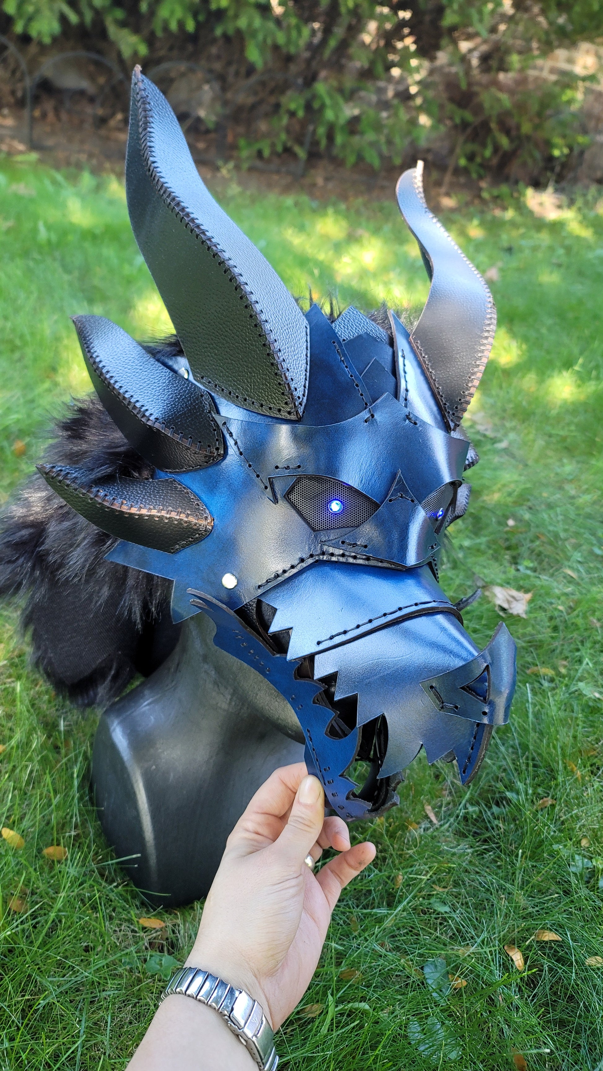 Articulate Spikey Leather Dragon Mask Furry Head Moving Jaw with Glowing Eyes