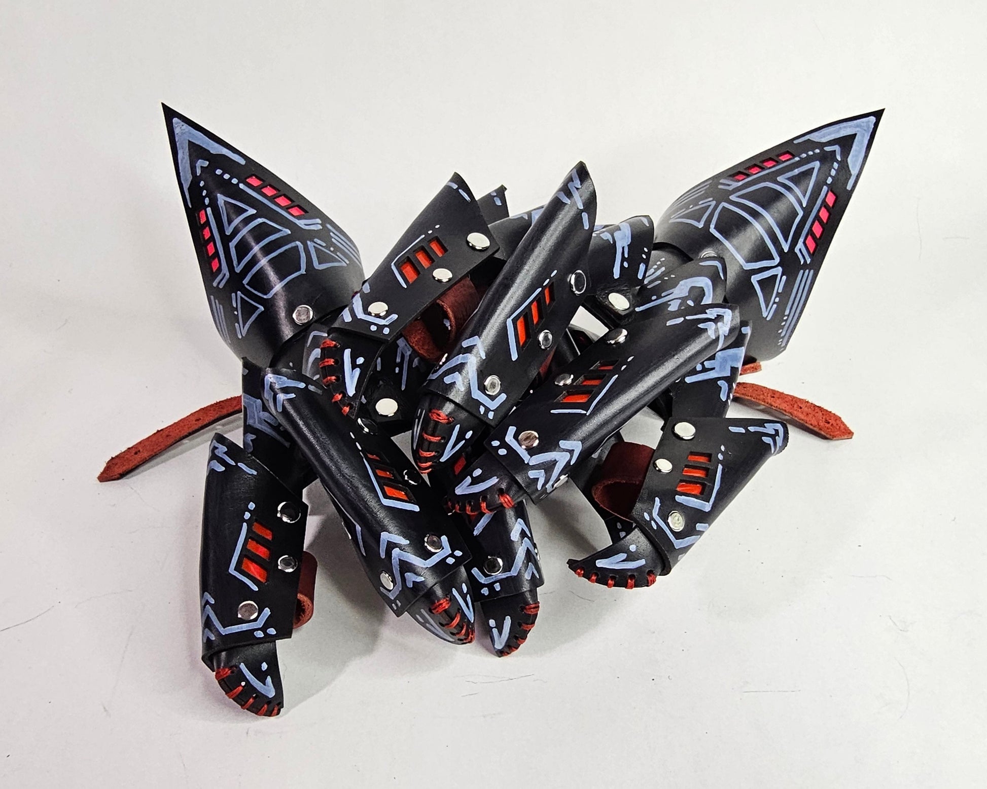 They are laser cut and made completely from leather, including the claw itself. This ensures better safety when wearing and using the claws and bracers.
