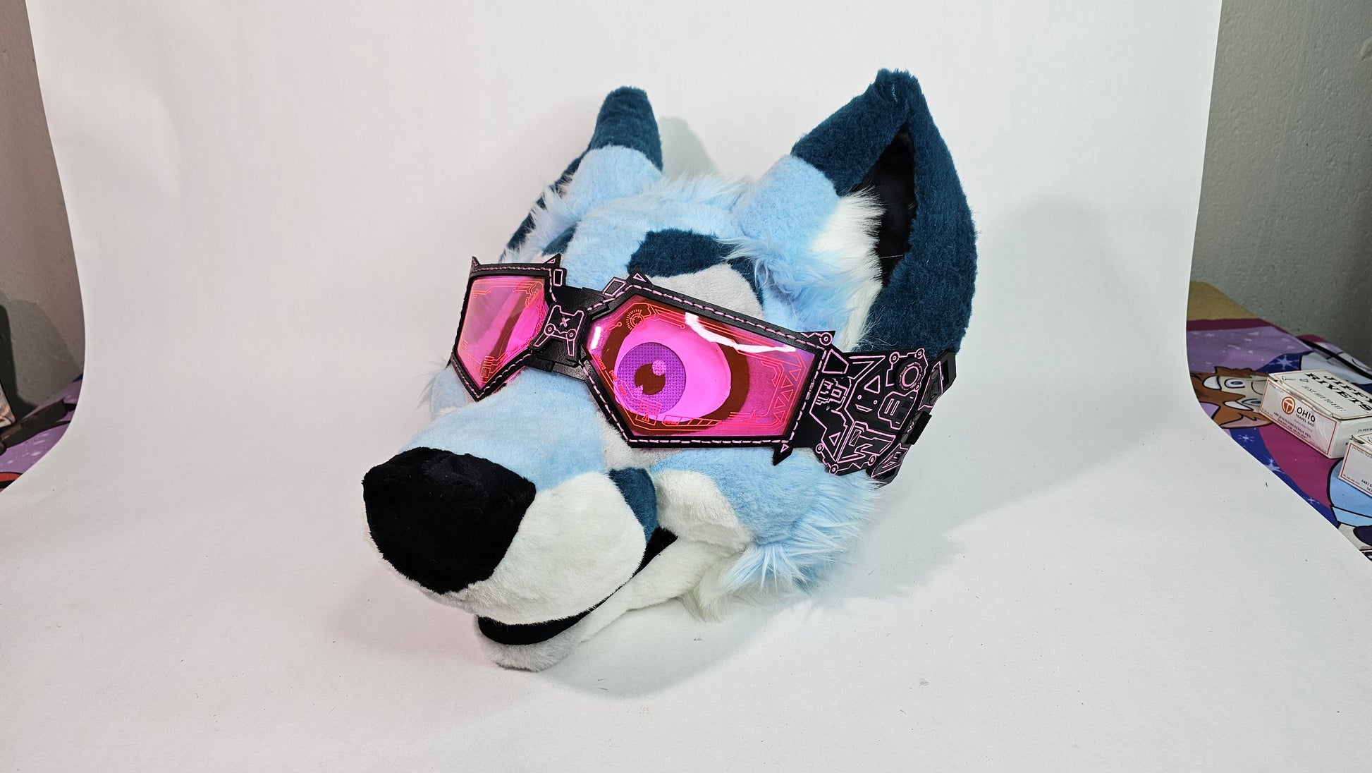 The future is now! Upgrade your style with these future punk goggles in various colors! These are designed to be worn around the back of the fursuit head, with an option to anchor them using the ears.
