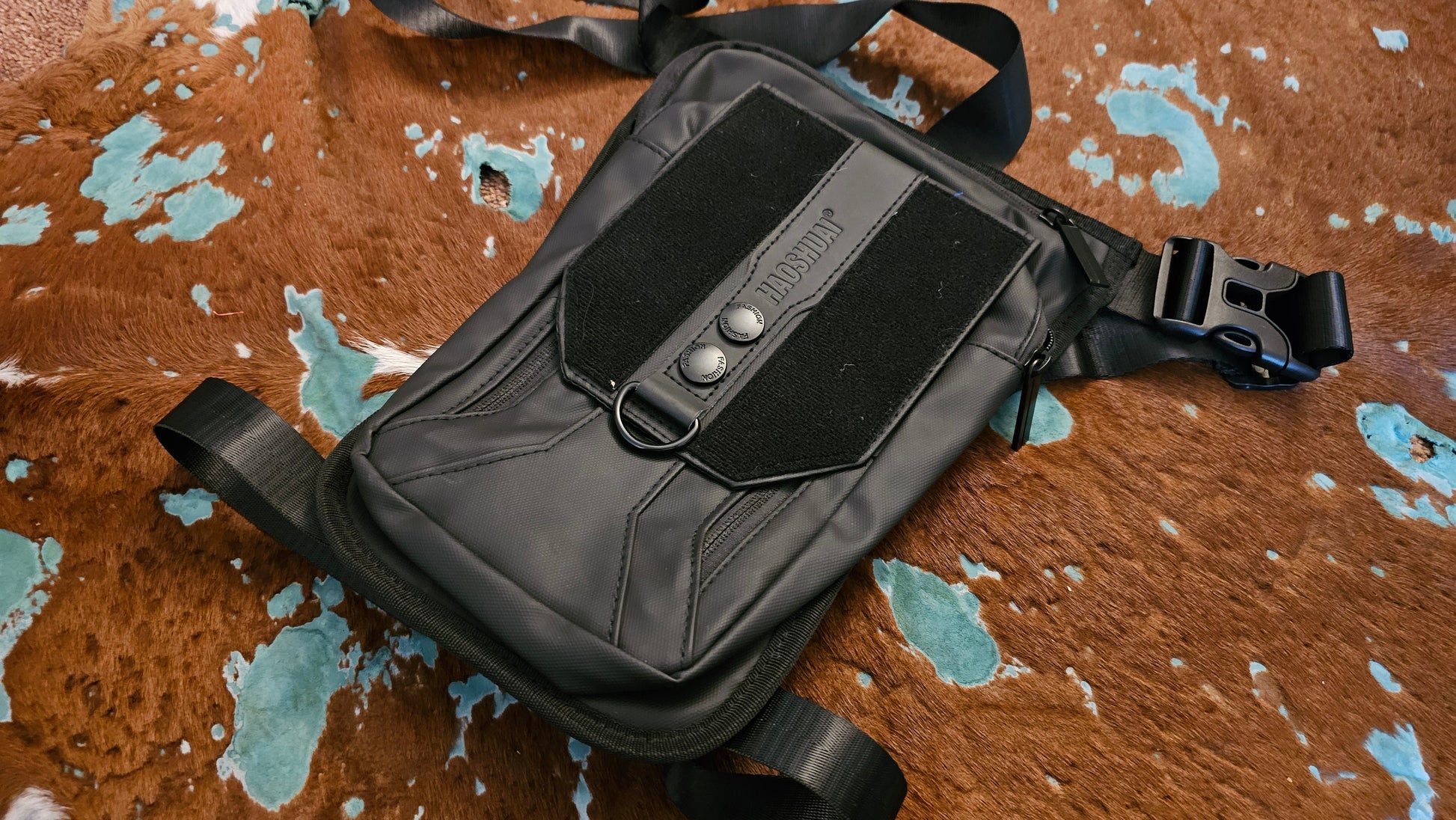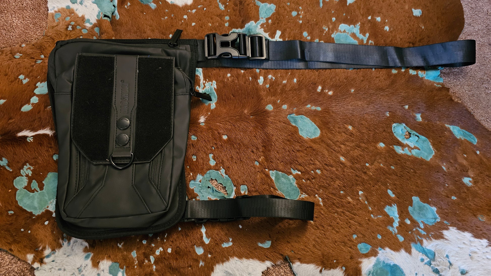 Bag is made from water-resistant materials (not leather). Bag is black with velcro (loop/soft side) strips on the flap to place your favorite patches on! (sold separately). There 4 large pockets for storage of all your items, and a short strap is included for you to anchor it to your thigh.