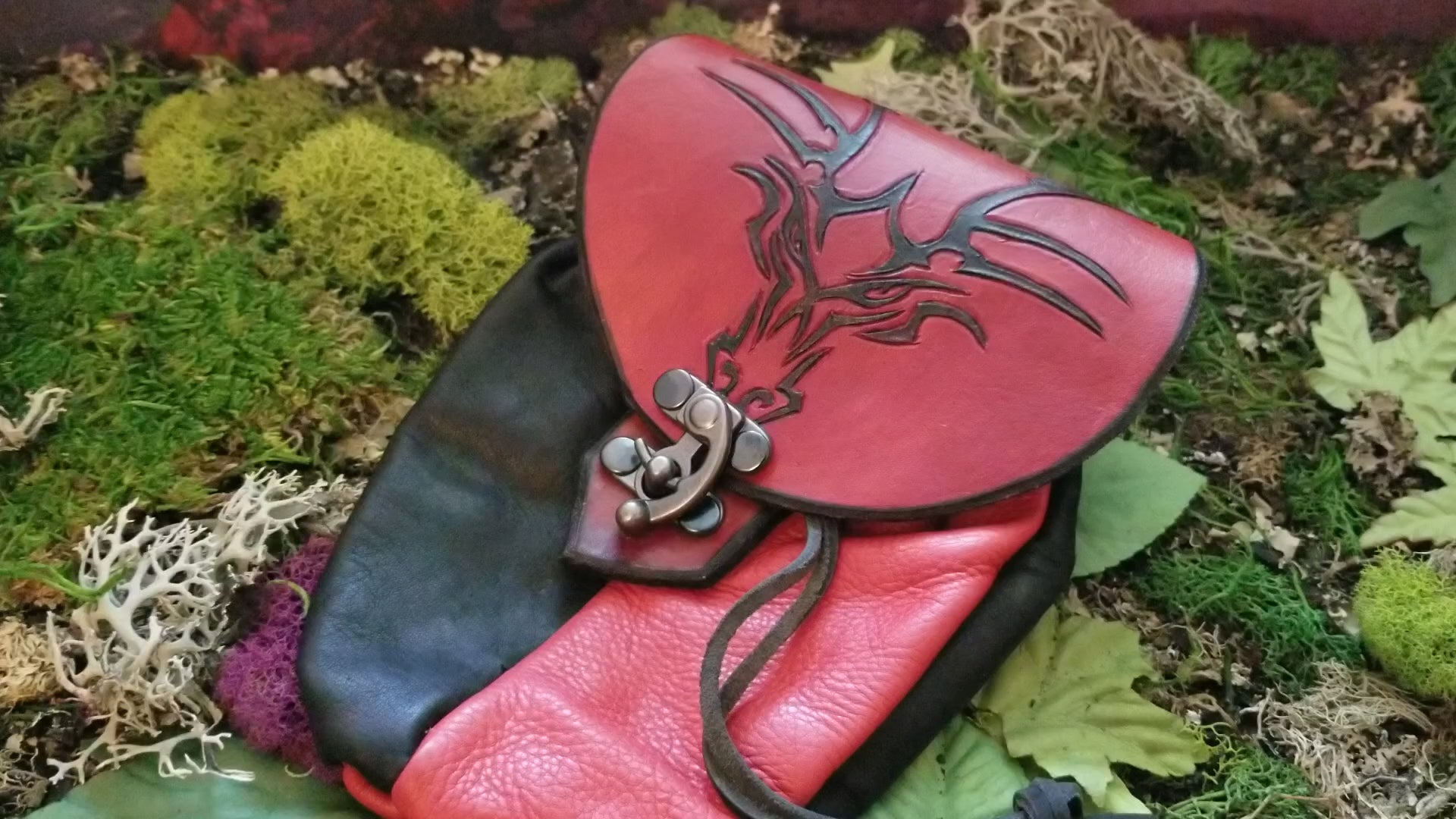 Great for carrying all of your supplies, accessories and more! This genuine hand-made, hand-dyed, hand-sewn leather dragon pouch is sure to be the best storage companion you can fasten to your belt.