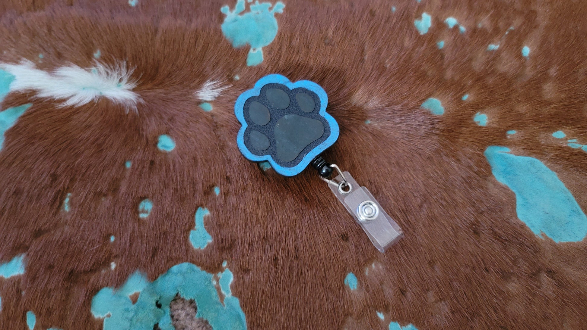 Take your badge with you in style! This Glowing Paw Print styled Badge Holder is a perfect addition to cosplay or everyday wear! This is made from 100% genuine cowhide leather. Laser cut, hand-dyed/colored. This is then glued onto the front of a standard round-sized badge clip.