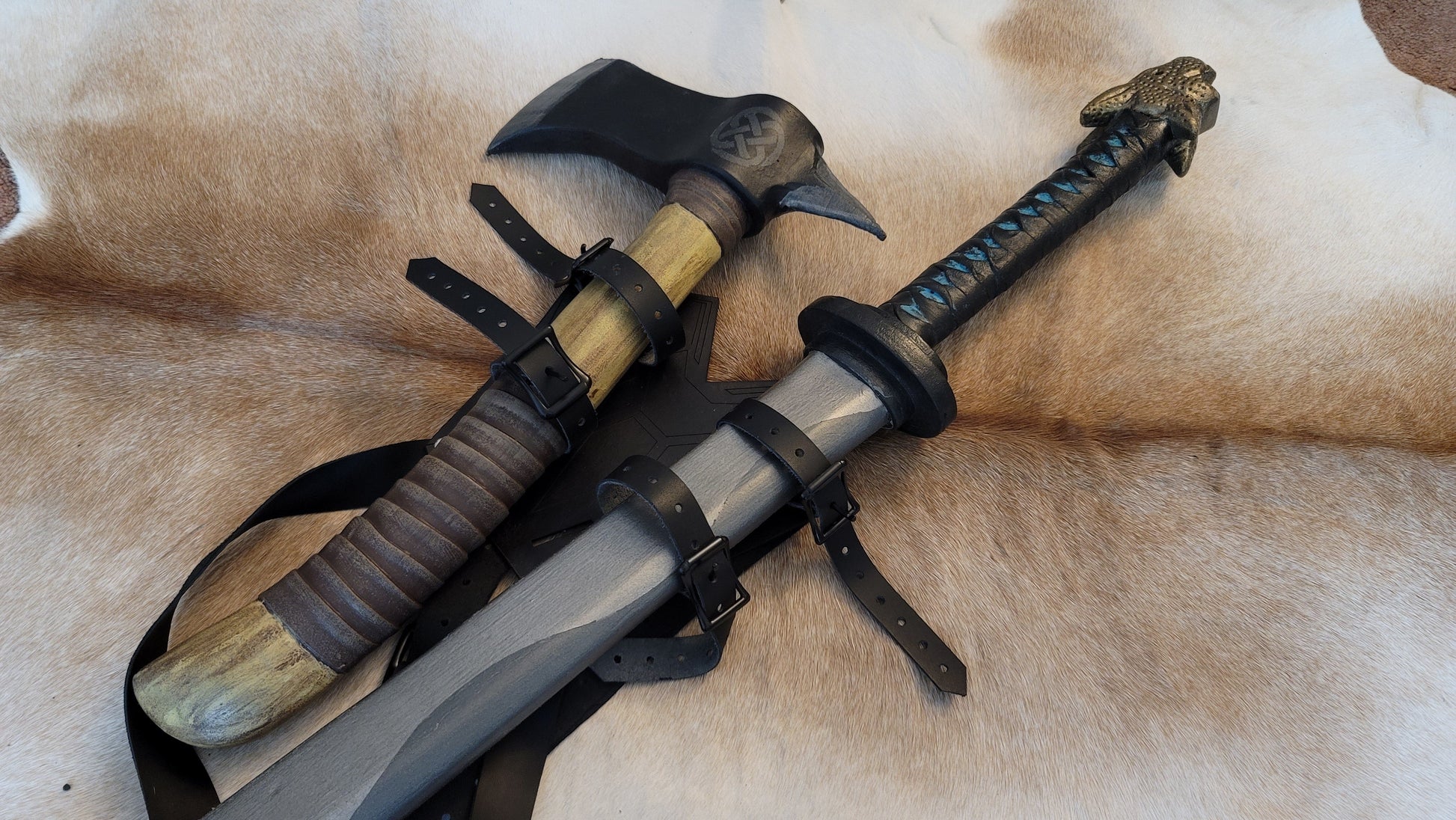 This is a Behind-the-back Sword Sheath used to carry up to 4 foam and latex props. It is designed to insert the swords vertically or at an angle for quick draw and for carrying ease.