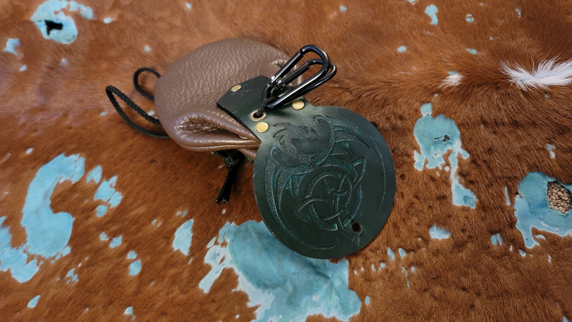 Great for carrying all of your supplies, accessories and more! They are laser cut/etched! This genuine hand-made, hand-dyed, hand-sewn leather dragon pouch is sure to be the best storage companion you can fasten to your belt.