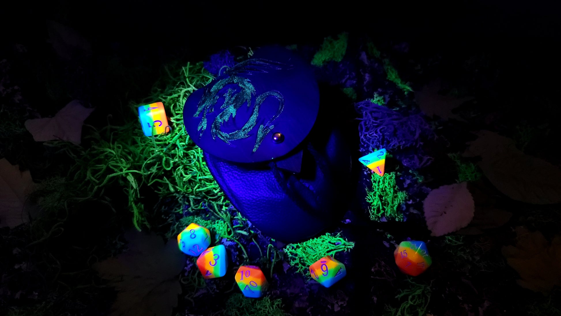 Small Leather Blue Spikey Dragon Dice Bag GLOW in the DARK